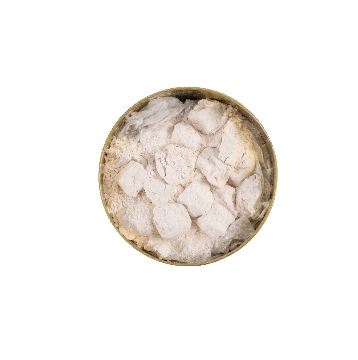 الوصف: من السما (المن)، ويسمى أيضًا بالمن والسلوى بالفستق واللوز والعسل. قطع نوكا ناعمة مستديرة الشكل في الطحين. الطحين هو الطريقة التقليدية لحفظ (المن) ومنع القطع من الالتصاق ببعضها البعض