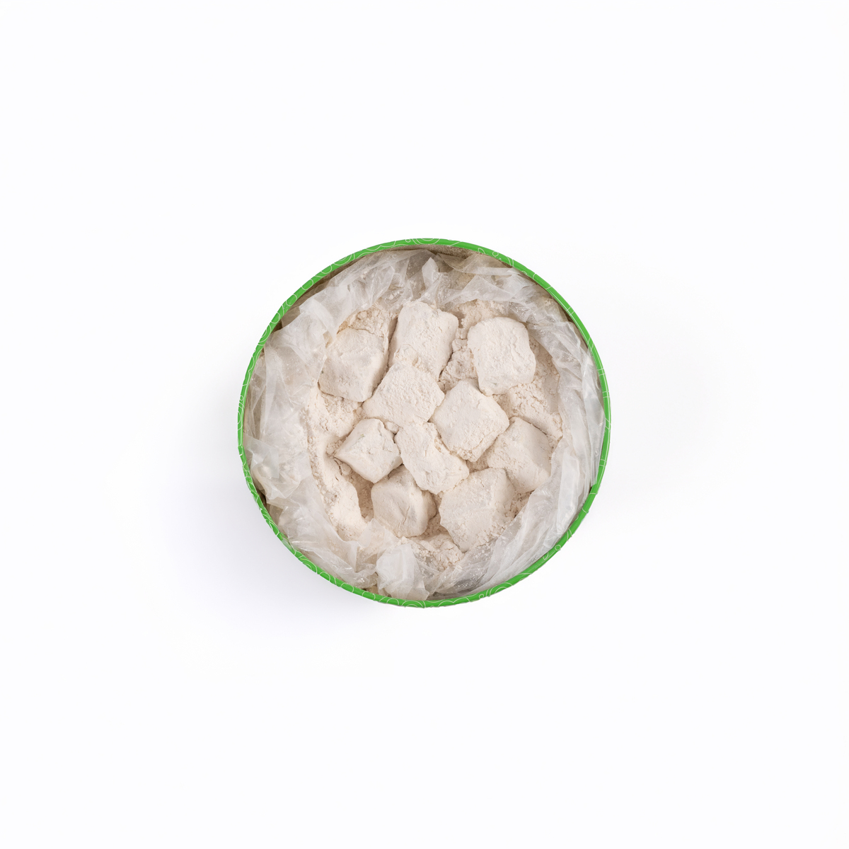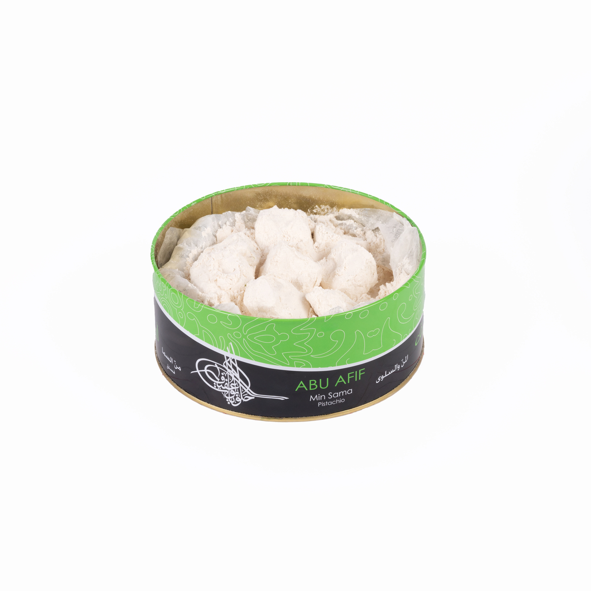 Description: Min Al Sima (Manna), also called Man Wa Salwa with Pistachio. Soft round-shaped nougat pieces in flour. The Flour is the traditional way the (Manna) pieces are preserved and prevents the pieces from sticking together.